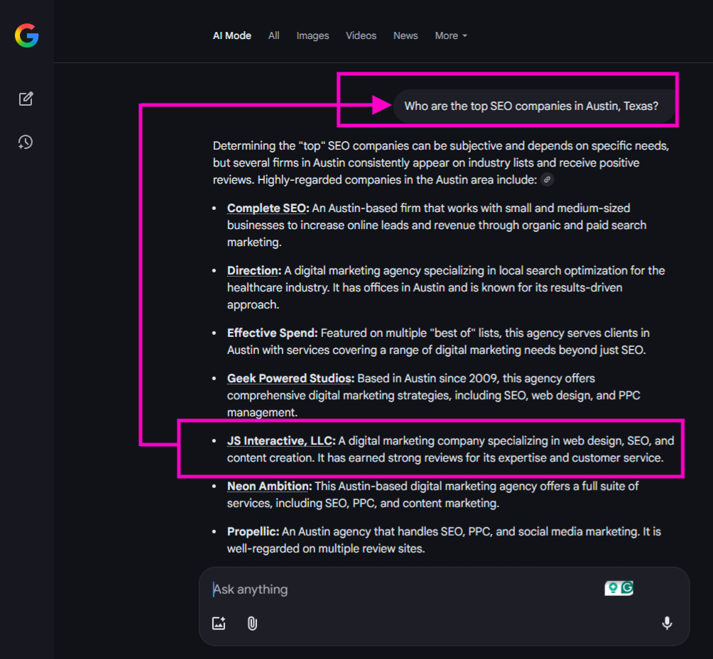 Even in AI Mode and other new search experiences, Google still pulls heavily from local sources, reinforcing how important your GBP, reviews, and local content truly are.